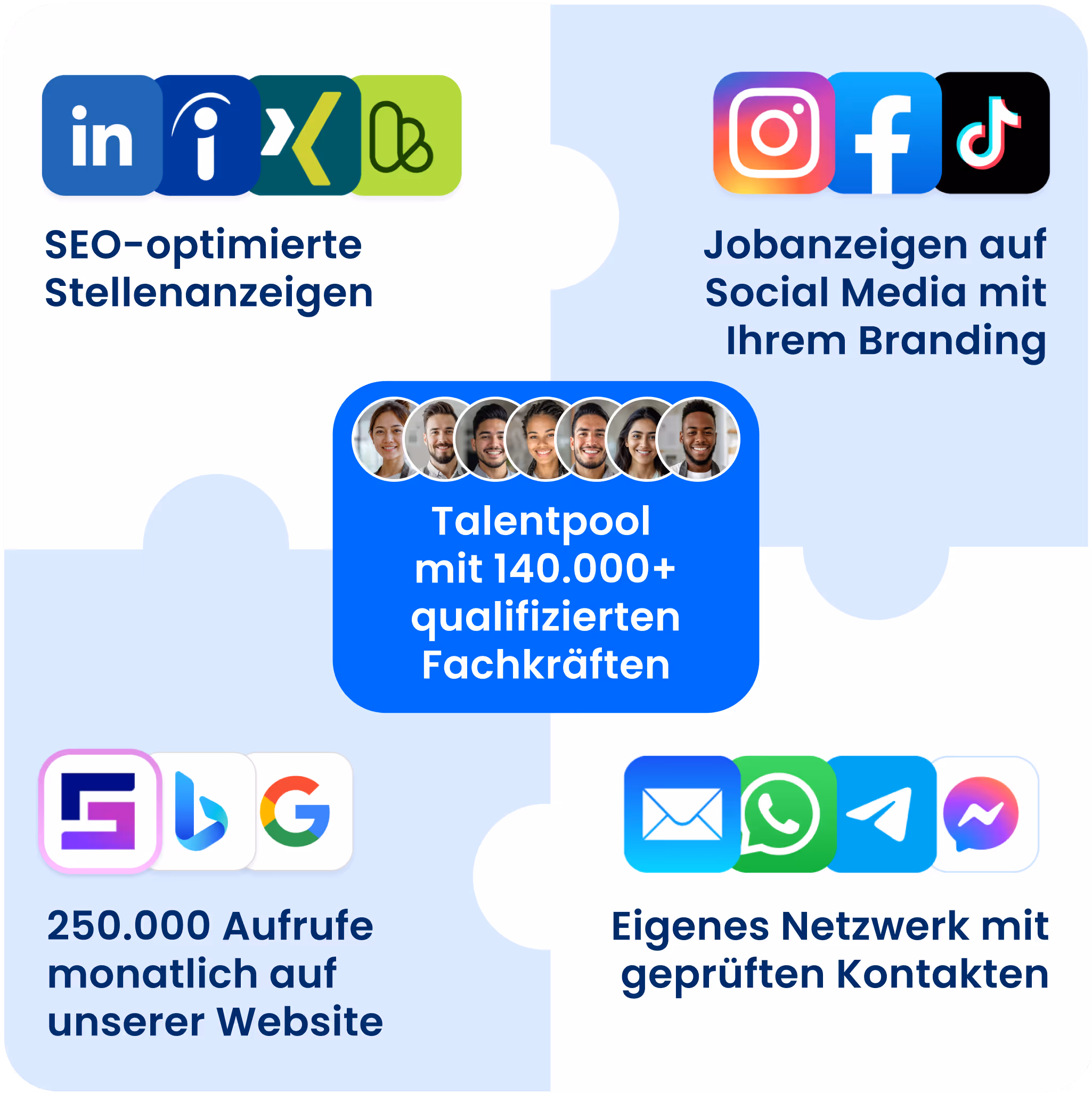 geprüfte Fachkräfte im unserem Bewerber-Pool. Durch Job-Newsletter, WhatsApp-Kampagnen und Mitarbeiter-werben-Mitarbeiter-Programme erreichen wir die Bewerber für Sie sofort.