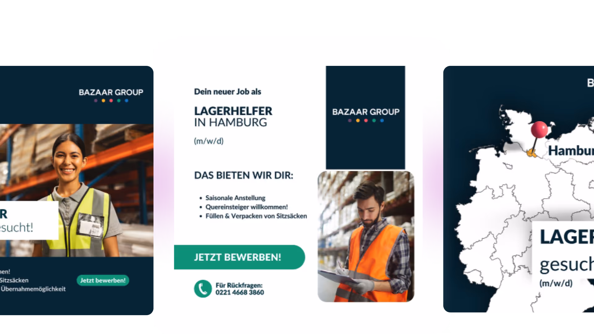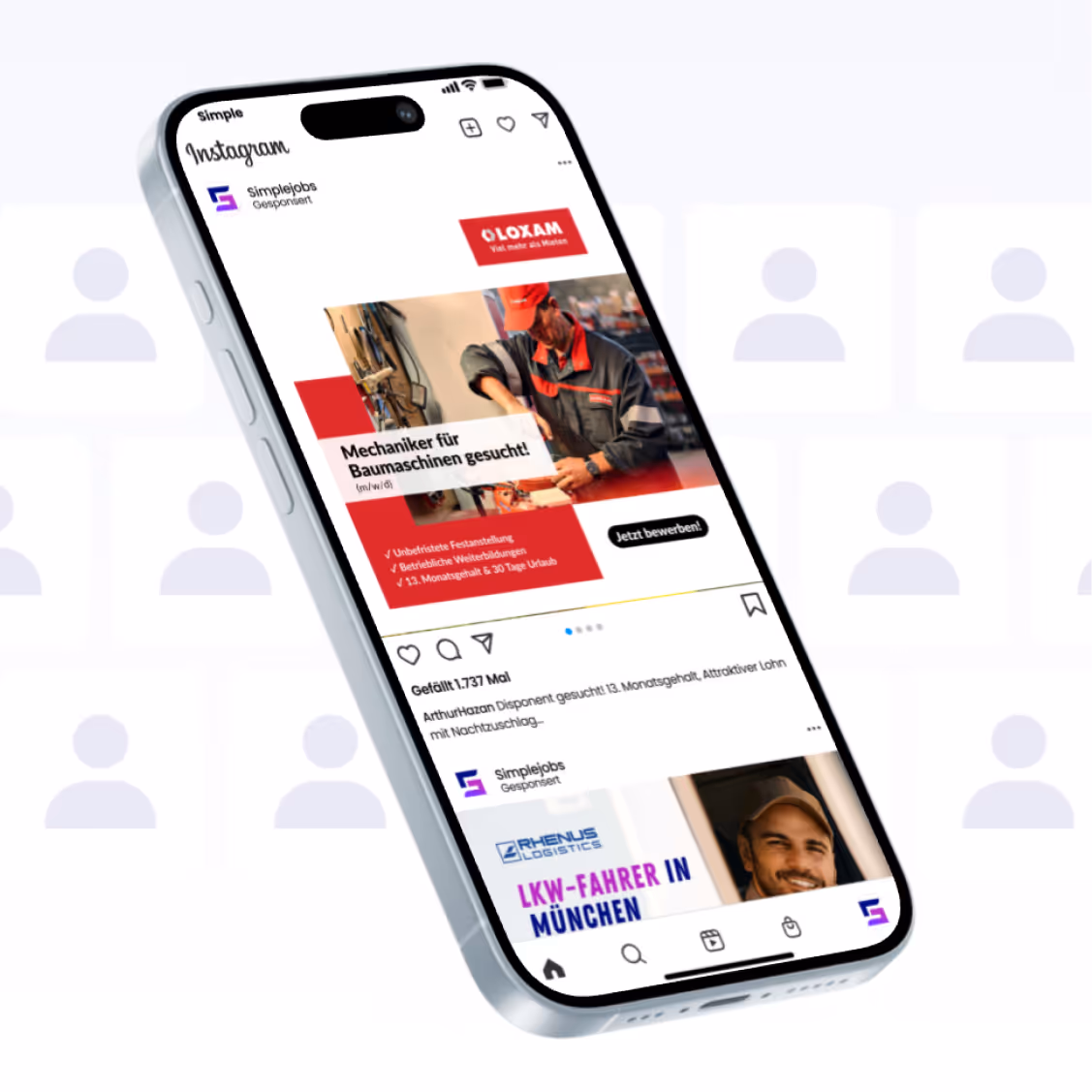 Über Social Media, Google, Kleinanzeigen, Jobbörsen und unsere eigene Datenbank mit 140.000+ Profilen schaffen wir maximale Reichweite – direkt auf dem Handy Ihrer Zielgruppe.
