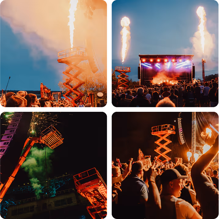 Vom Staplerfahren über Bagger Geschicklichkeitsübungen bis hin zu Körben auf einem hochmontierten Basketballkorb gab es viele Möglichkeiten, selbst aktiv zu werden. Abends standen Konzerte und DJ Sets auf dem Programm, die wir mit unserer Technik und Pyroeffekten begleiten durften.