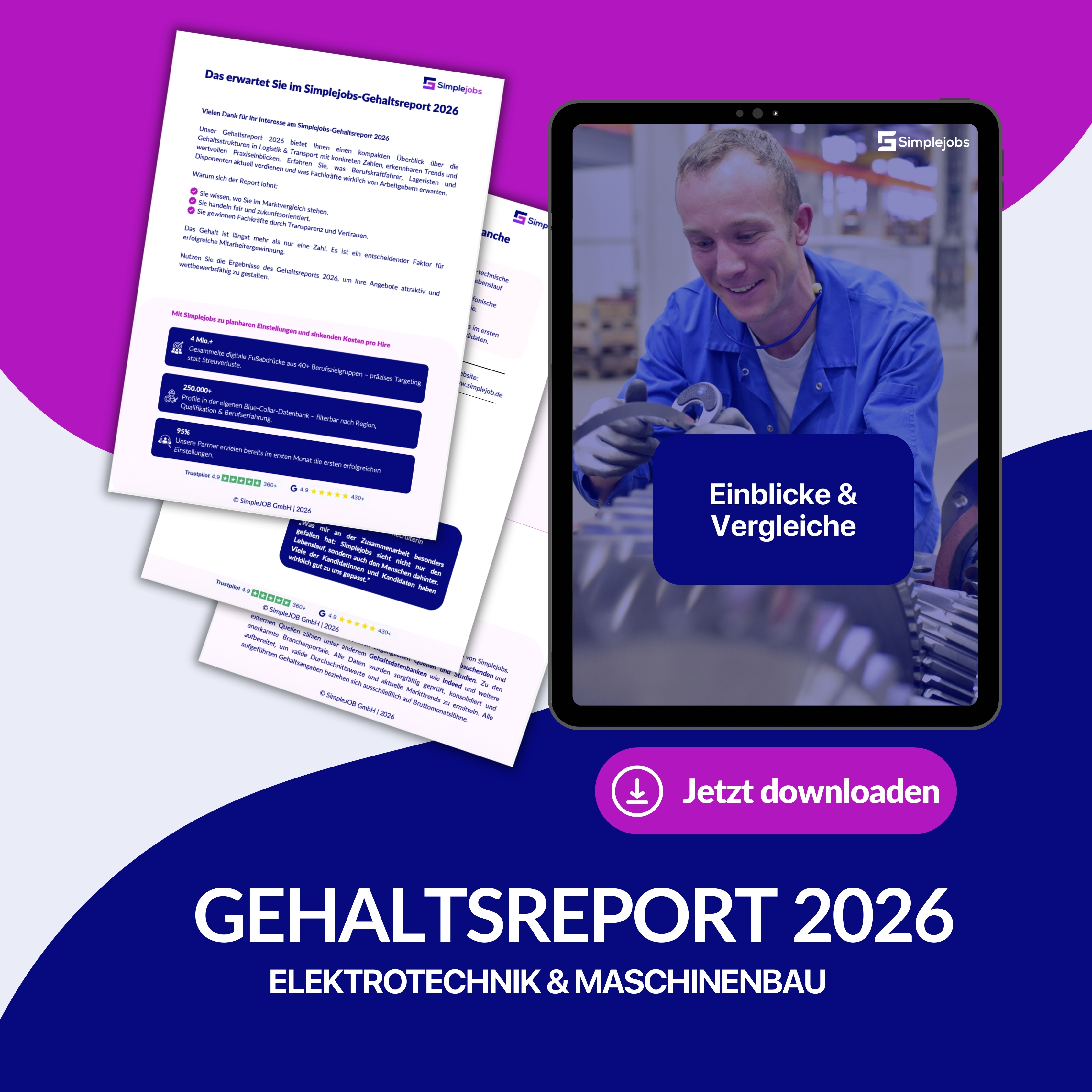 Der Gehaltsreport 2026 für Elektrotechnik & Maschinenbau von Simplejobs bietet einen umfassenden Überblick über aktuelle Gehaltsstrukturen in technischen Industrieberufen, typische Gehaltsspannen sowie Entwicklungen im Arbeitsmarkt. Die Analyse basiert auf internen Daten von über 250.000 registrierten Jobsuchenden, ergänzt durch Daten aus anerkannten Gehaltsdatenbanken und Branchenstudien.